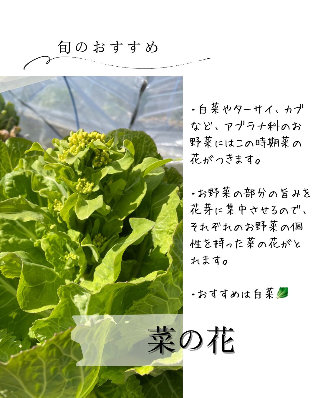 冬のお野菜たちは花芽をつける季節になり、いろいろなお野菜の菜花が伸び、元のお野菜の特徴を残した菜花が楽しめる時期です。
